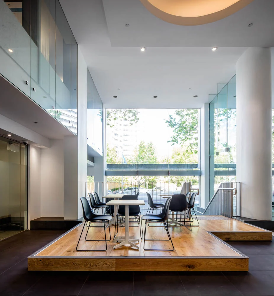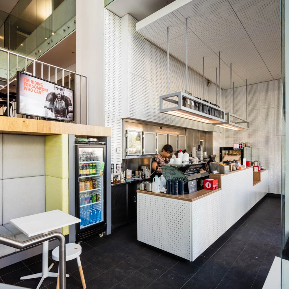 Pedestrian ‘flow’ was improved via an interconnecting stair that was designed to allow direct connection between the lobby and café space. A raised platform was incorporated to delineate the café space and formal lobby area setting but also to extend as an architectural feature of the stair. The stair not only provided direct access from the lift lobby to the café space but also encouraged the use of the café by the building tenants for functions and presentations occurring in the building.