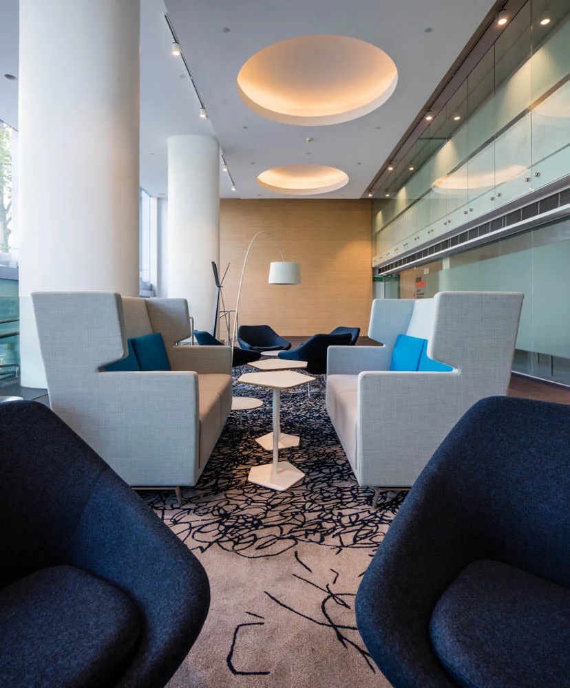Various work settings were provided to allow for casual meetings and encourage the use of the space rather than simply as a thoroughfare. New floor tiles, acoustic wall panels, energy efficient lighting and furniture wer provided in a combination of heights and sizes allow. The new settings create an agile, flexible space for ad-hoc meetings or coffee catch ups. A new custom designed feature rug was also installed.