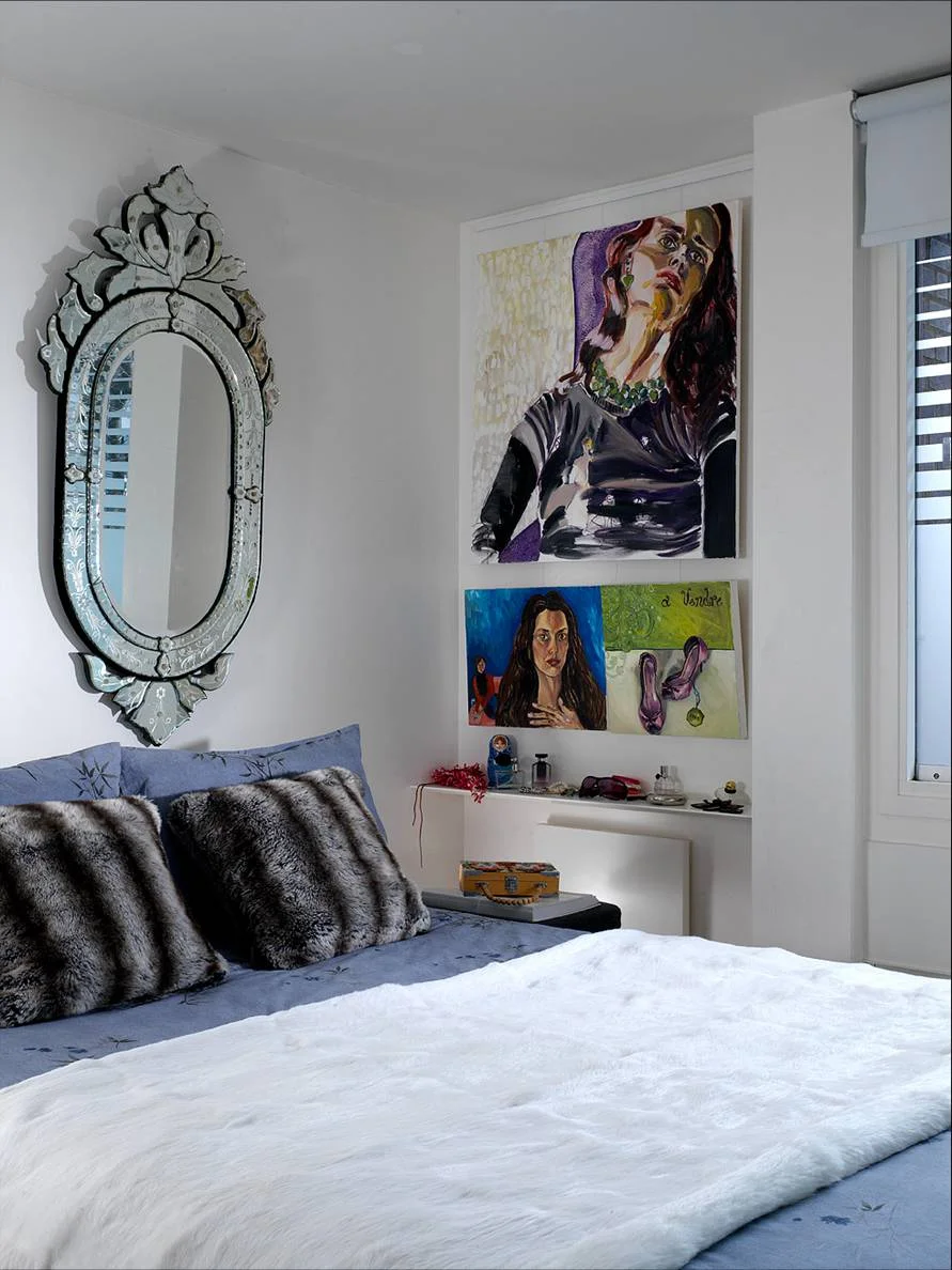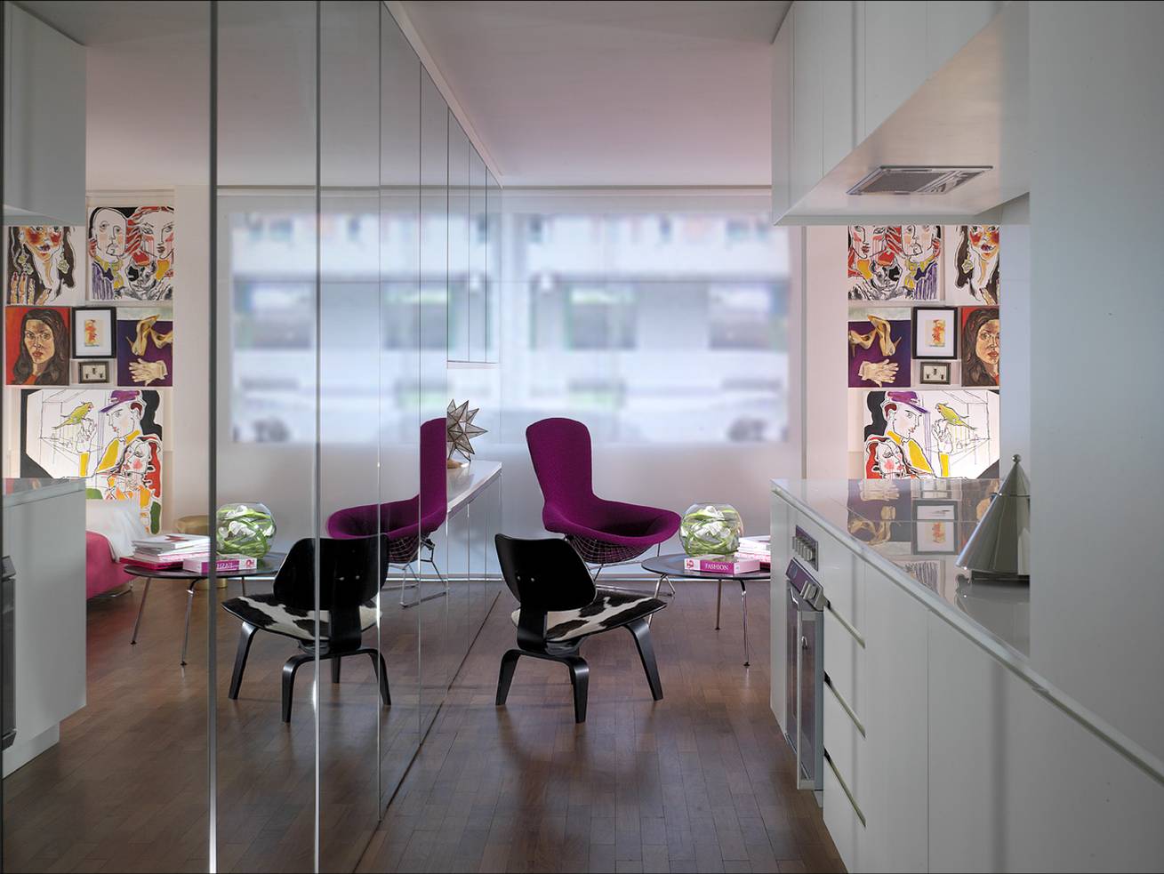 To this end the apartment palette is simple and the surfaces are smooth and reflecting. Spanning the entire length of the apartment, a mass of floor to ceiling mirrors create a continuous reflection which expands the interior and reflects light within. The perfect illusion, the mirrors conceal an expanse of cupboards, study, bathroom, and entertainment equipment keeping the apartment visually uncluttered.