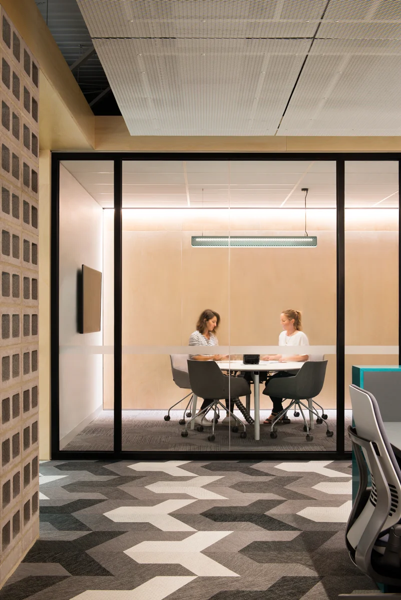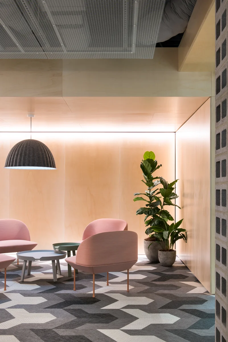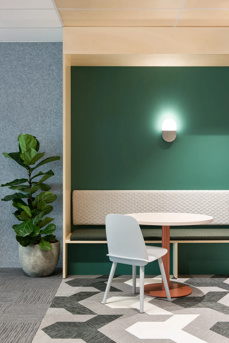 In areas with high activity (such as the reception, kitchen, meeting and collaborative spaces) bold colour blocking was used in the finishes and materials to contrast against the fairly neutral work areas. Colour was combined with natural timbers, patterned flooring and the greenery of the building’s central void to signify the vibrancy and creativity at the core of the PEXA brand. The blue and green tones used signify creativity, intelligence and vibrancy.