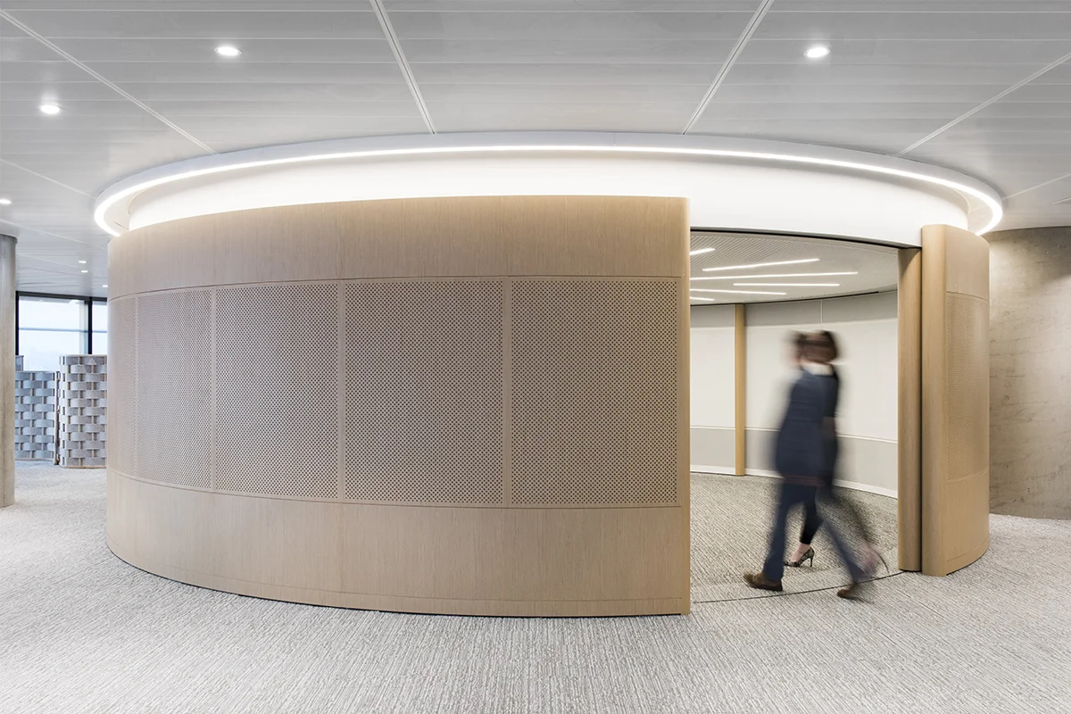 Circulation and screens between settings are used as acoustic barriers and the softness of the round forms work with the lozenge shape of the building. Throughout these Client Collaboration floors there is an emphasis on community, choice and collaboration in an environment that is the first of its kind in Australia.