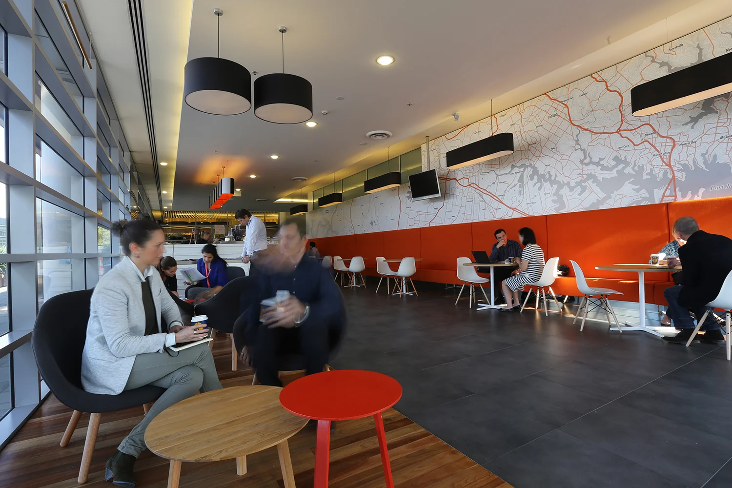 The foyer cafe features a vibrant colour palette, upholstered banquet seating and occasional chairs, textural cladding and ambient low pendant lighting. The full height ‘map’ super graphic punctuates the space and serves to locate the building in the context of greater Sydney, providing a conversation starter for patrons and visitors.