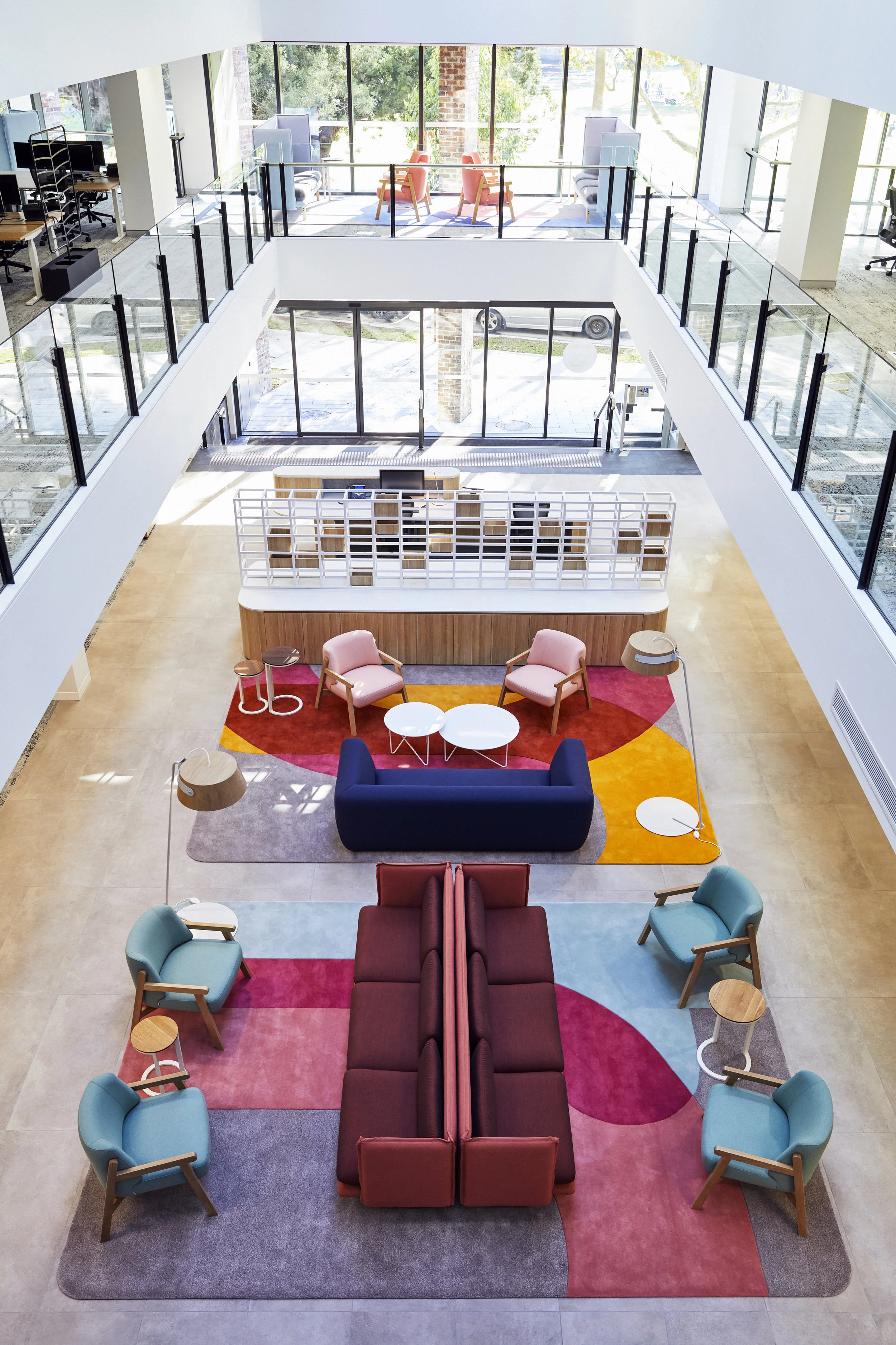 The ‘community spaces’ (including the breakout, social-net space & ‘kids zone’) are clearly visible from the street, with the large expanse of glazed façade framing the vibrant, colourful zones, carefully positioned to encourage the local community to enter the space. The authentic use of materials, bold and carefully curated layering of colour, texture and pattern helps to identify points of activation within the space, and seeks to connect people, business and environment. Driven by TBS’s vibrant company branding, the use of colourful graphics, furniture and finishes applied to a white backdrop translates the company culture into the interior environment.