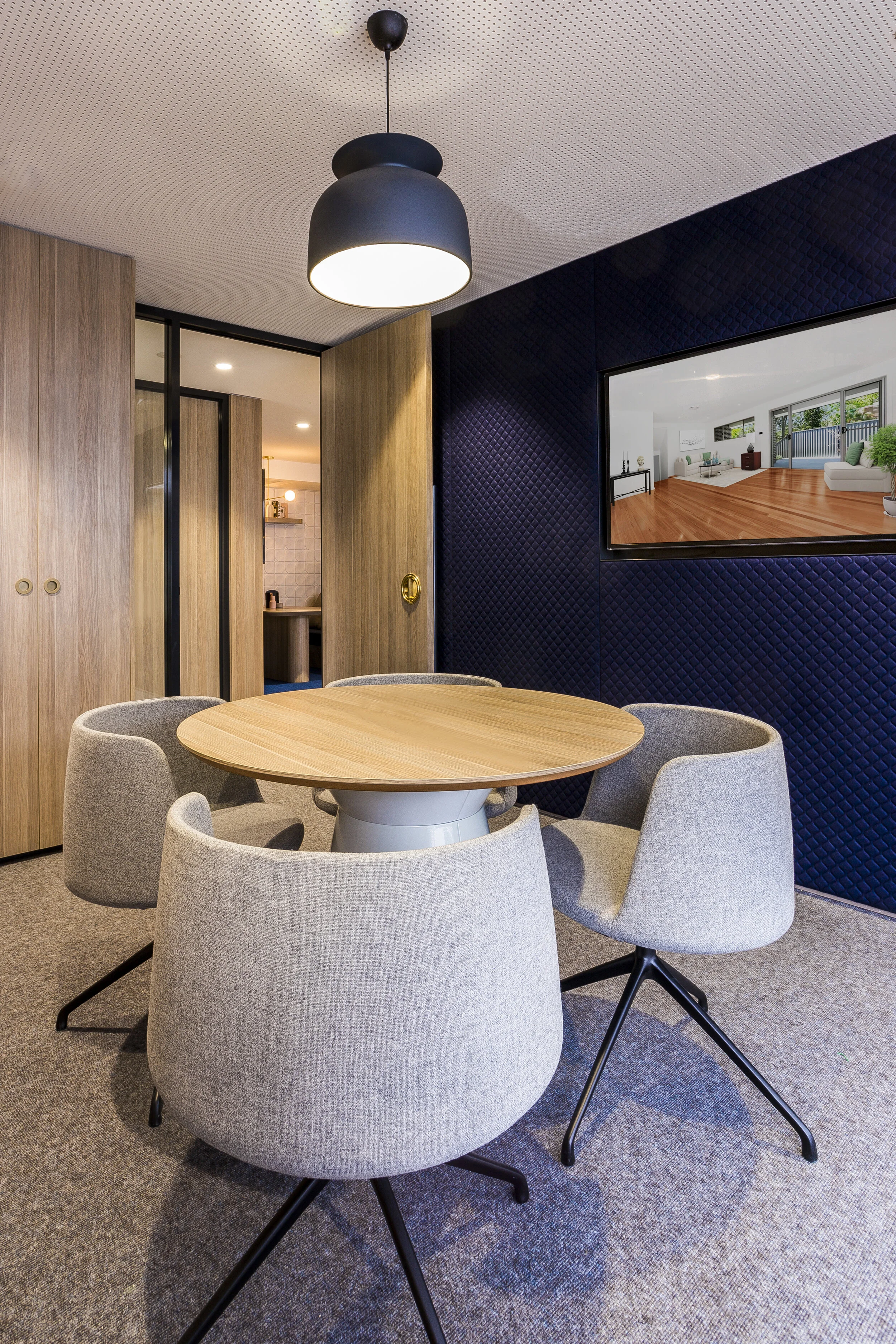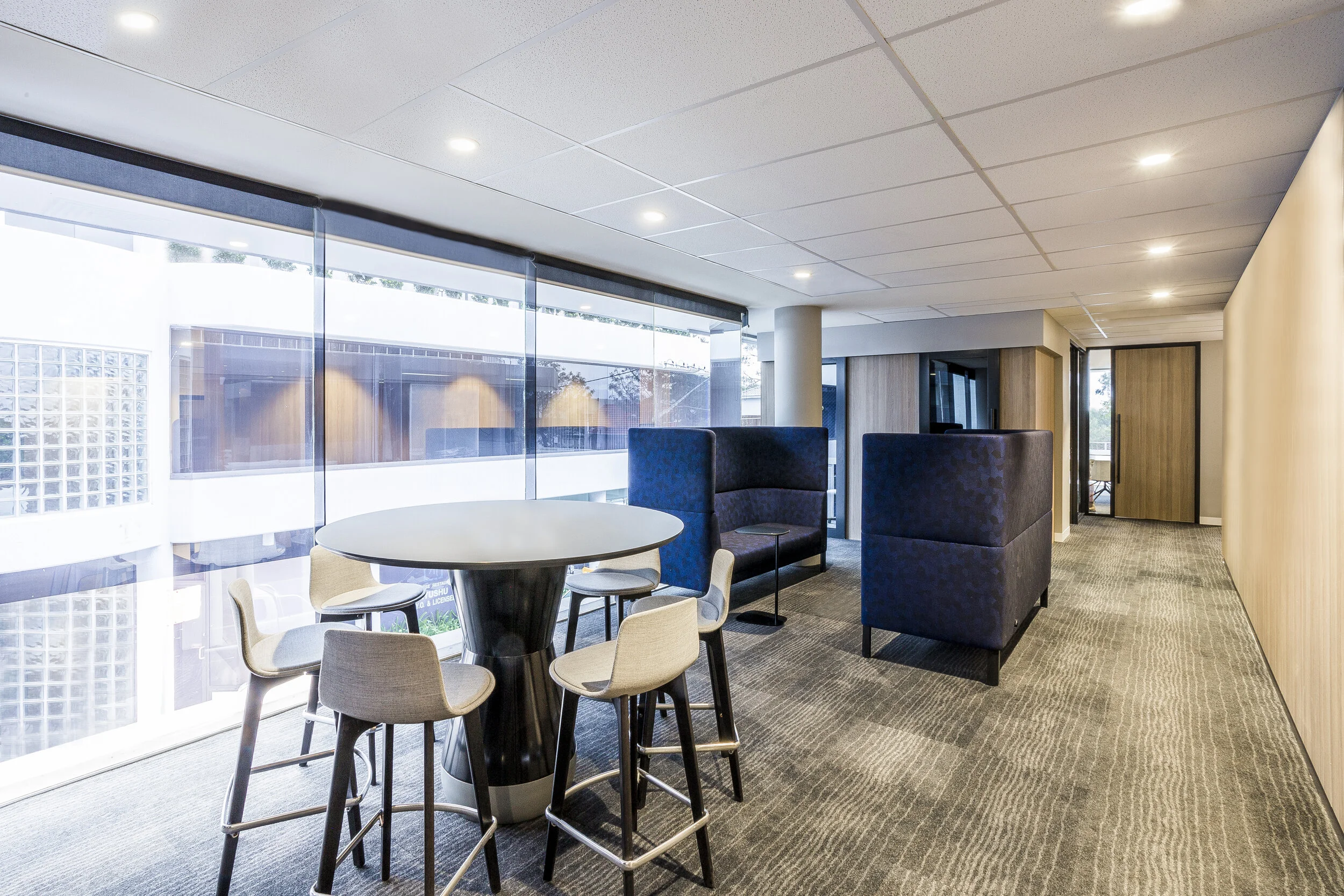 The palette is a blend of warm tones on a masculine backdrop, with sophisticated layering of texture and tones creating depth and translating McGrath’s strong brand identity. Brass tones and stone surfaces are juxtaposed with soft edges and curved forms, with joinery elements acting as subtle guides for users moving through the space. Natural timbers and blue highlights offer a sense of locality; the design inviting local clientele into the space and providing a sense of familiarity. Overall, this new agile environment strengthens McGrath’s ability to service their clients and support their people in a new way of working.